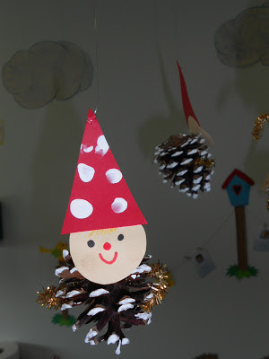 Com as pinhas resolvemos fazer um pai natal,e os fraldinhas pintaram o chapéu com os seus dedos.